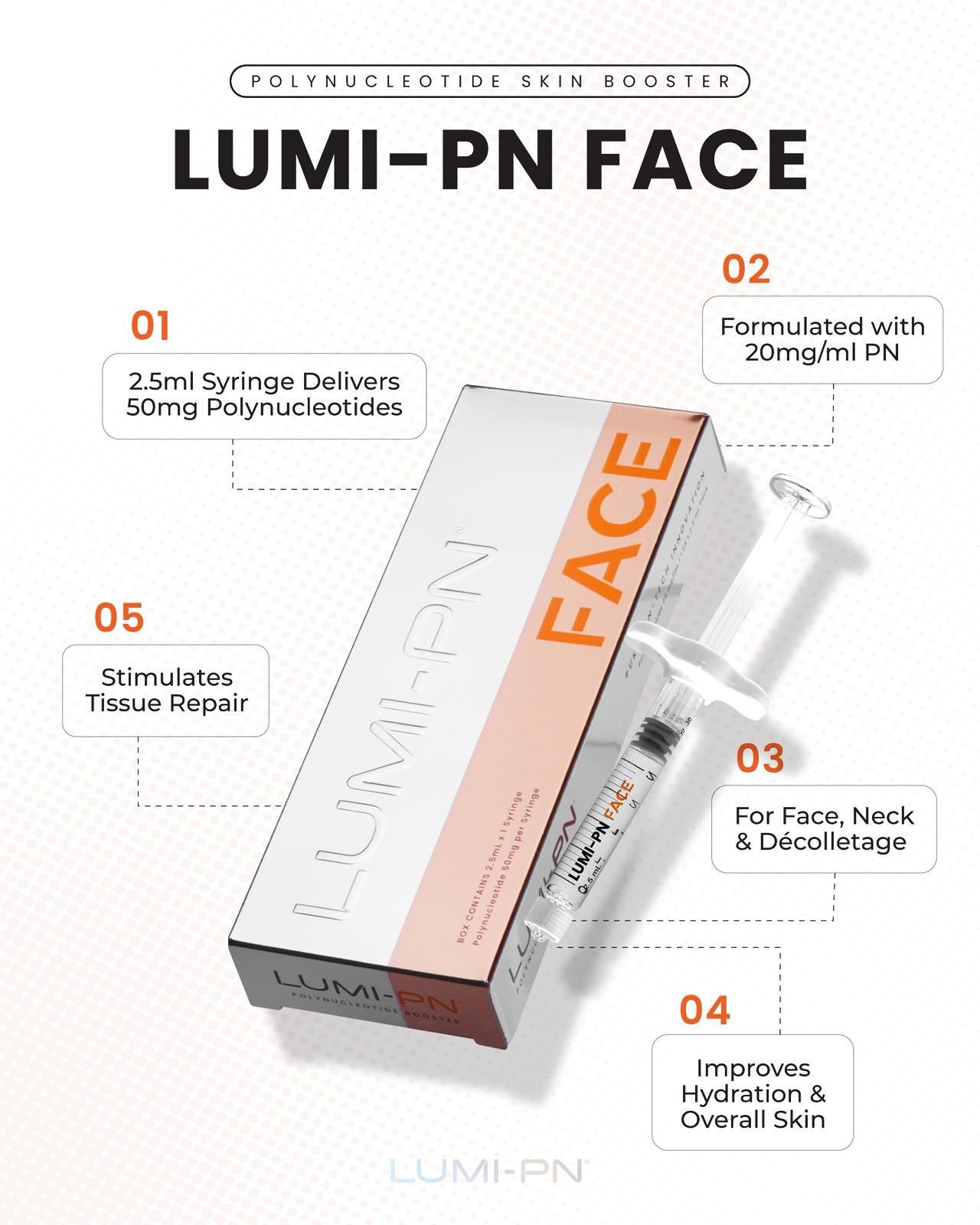 Lumi-PN Face stands out for its exceptional quality and advanced PN formulation, engineered specifically for full-face rejuvenation. Unlike standard skin boosters, Lumi-PN Face delivers high-grade polynucleotides that support natural tissue repair, hydration balance and long-term skin health.